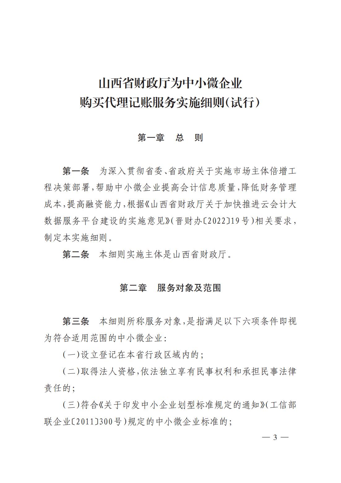 為進(jìn)一步支持全省中小微企業(yè)持續(xù)快速健康發(fā)展,切實(shí)加強(qiáng)和改進(jìn)會計服務(wù)能力,根據(jù)《山西省人民政府辦公廳關(guān)于印發(fā)強(qiáng)化市場主體倍增要素服務(wù)保障若干措施(試行)的通知》(晉政辦發(fā)〔2022〕7 號)、《山西省財政廳關(guān)于加快推進(jìn)云會計大數(shù)據(jù)服務(wù)平臺建設(shè)的實(shí)施意見》(晉財辦〔2022〕19 號)文件要求,省財政廳研究制定了《山西省財政廳為中小微企業(yè)購買代理記賬服務(wù)實(shí)施細(xì)則(試行)》,現(xiàn)予以印發(fā),請結(jié)合工作實(shí)際,認(rèn)真抓好貫徹落實(shí)。